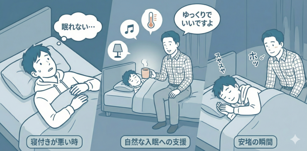 ムリに「寝てもらおう」とするとうまく行かないので、自然に眠くなるような工夫をしています。