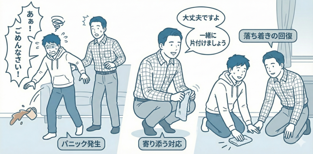 ご利用者の中には、モノを落としたり飲み物をこぼしたり、自分の想定外の事が起こることによって「落ち着かない状態」になり、大声を発したりすることがあります。その状態になると、支援するワタシも「どうしたどうした!?」と、慌てます。慌てると更に事態が悪い方向に・・・